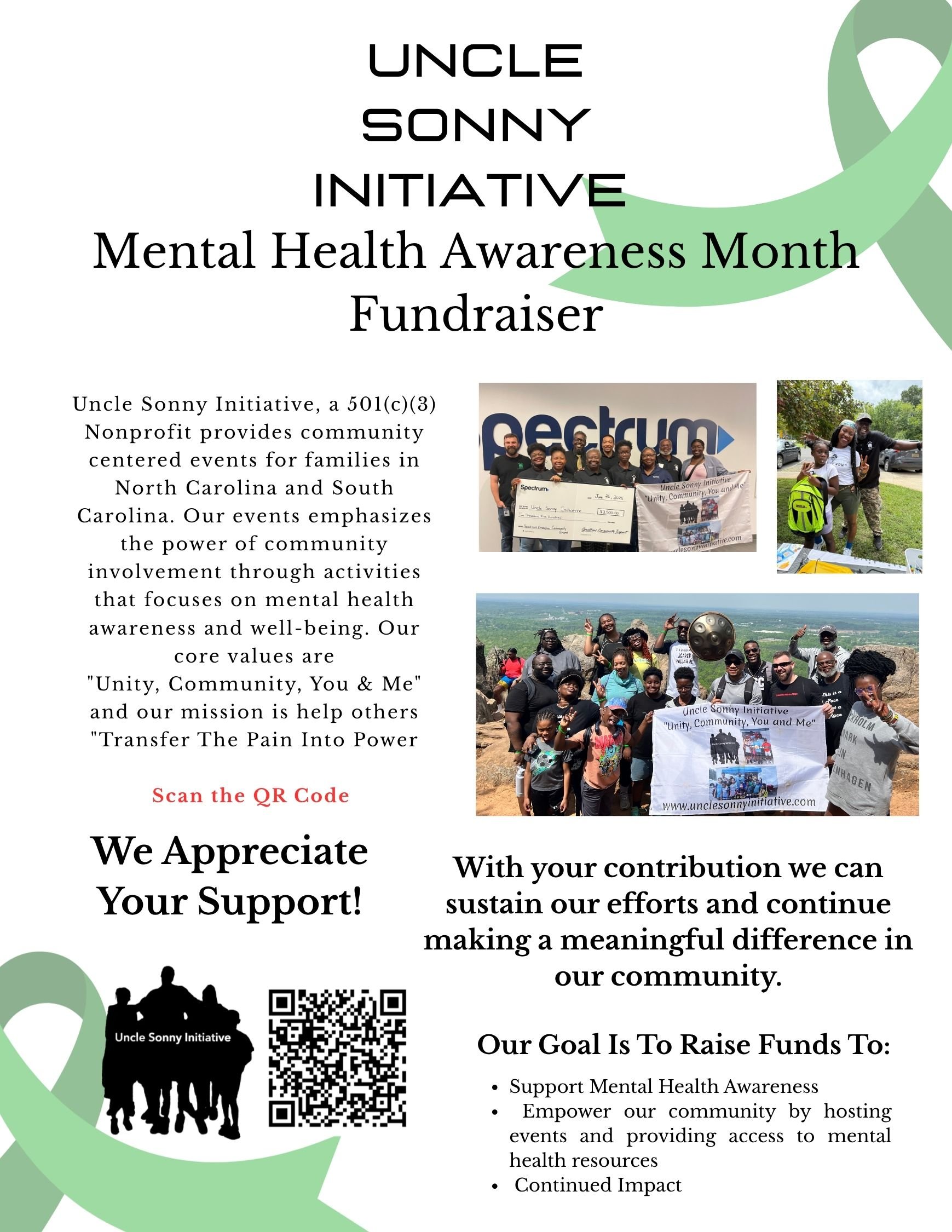 Uncle Sonny Initiative 501c3 is an organization offering community service and family oriented events in North and South Carolina. Our goal is to provide events and services to families with children ages 7 to 17 that focus on the wellbeing of the children, introduce them to new activities and emphasize their importance in the community. We encourage them to challenge themselves academically, be active in their communities and Transfer the Pain into Power in all that they do. We educate them on our core value of “Unity, Community, You and Me” so that they know the value they bring to their families and communities.